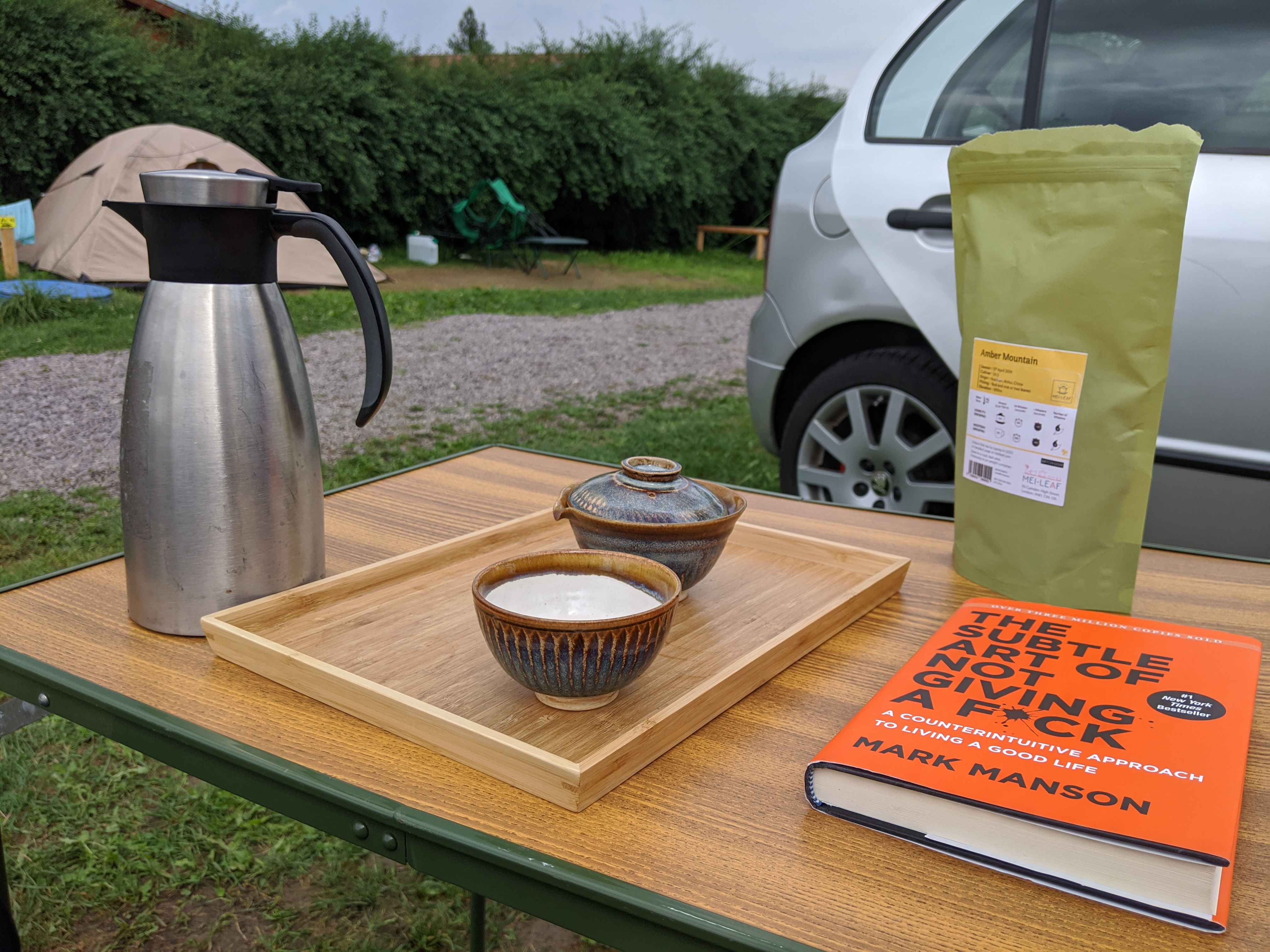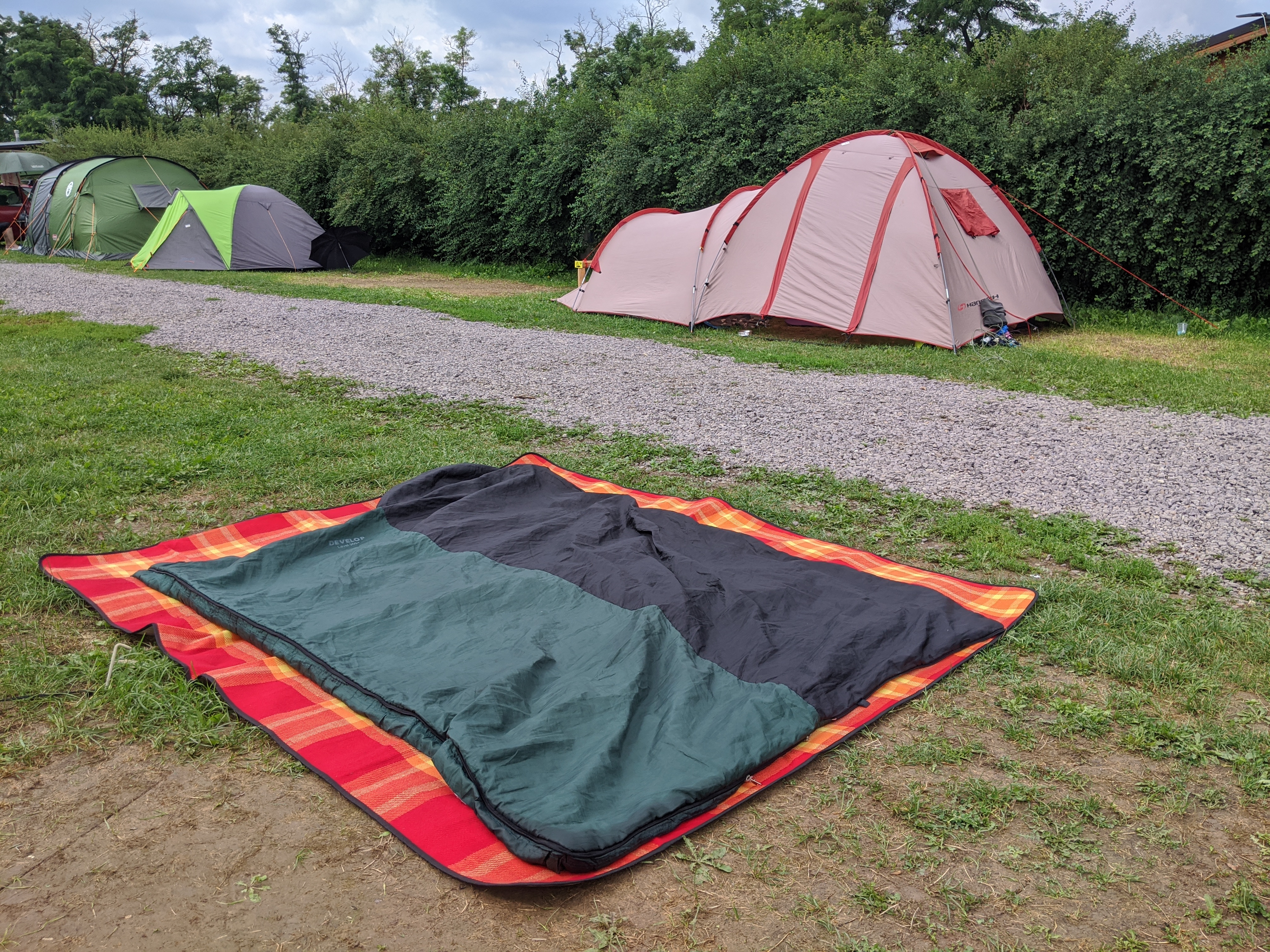 Zrušil jsem tedy své plány na výlet a rozhodl jsem se, že zůstanu v kempu, ostatně čajovat se tu také dá a číst tu taky můžu, no a začal jsem plánovat, jak vše usuším. Zde mi došlo, že by se mi vlastně hodil ten fén, který jsem zcela takticky a záměrně nechal v Praze na bytě. No prostě mě baví si věci komplikovat no. Roztáhl jsem tedy piknikovou deku (stejně se zítra bude v tom bahně a mokru nejspíše někde válet :) ), na ní jsem hodil spacák a hurá, provizorní sušící místo bylo na světě!